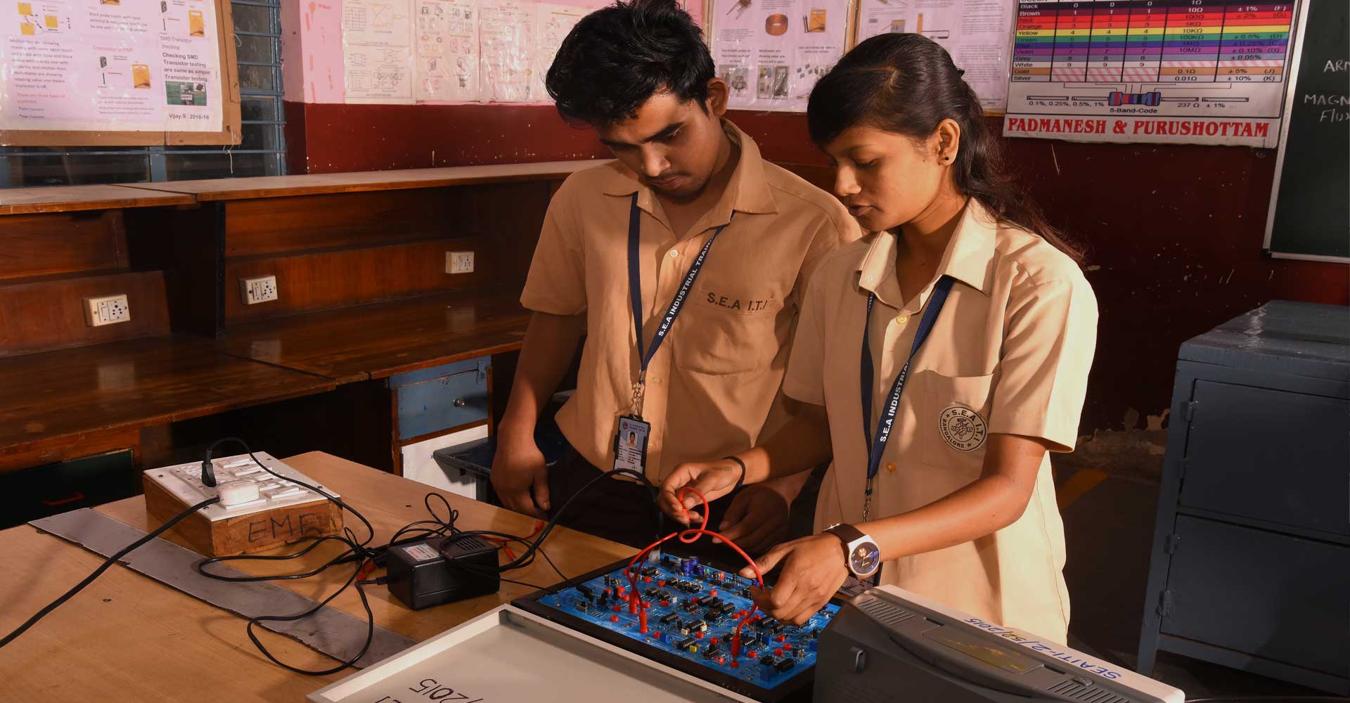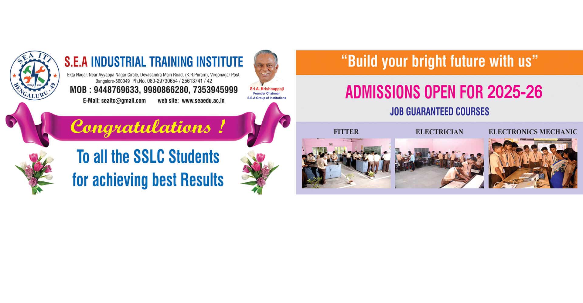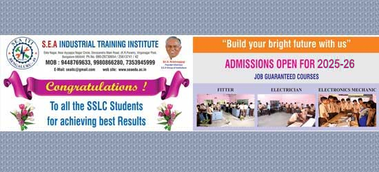 The SEA Industrial Training Institute (ITI) was established in 2004 and inaugurated by SRI THANVEER SAIT Honarable Minister for Labour, Govt. of Karnataka presided by our Chairman Sri.A.Krishnappa sir with two trades FITTER & ELECTRONIC MECHANIC. And in 2009 ELECTRICIAN trade is also introduced. Our Chairman has started this ITI to provide employment to economically poor background class students, who due to various reasons, are unable to pursue further studies after SSLC.